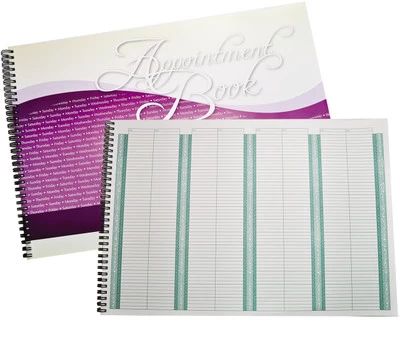 Appointment book. Eight column per page. Shows times from 8 AM to 7 PM. Includes a page for notes and frequently called numbers.