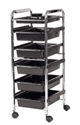 Beauty Trolley, Black, (model 936) A storage tray for beauty ware. Made of high grade ABS. Features five movable tray drawers and one stationary tray. 34″Hx15″Dx11″W