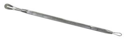 Stainless Steel, two sided. Small loop used for whiteheads; flat side use to extract blackheads.